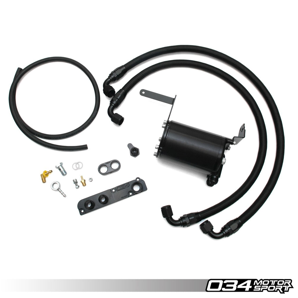 The 034Motorsport B7 Audi A4 2.0T FSI Catch Can Kit is here! We've put months of engineering and testing to create the most complete and effective catch can kit on the market. The 034Motorsport B7 Audi A4 2.0T FSI Catch Can Kit features a completely new proprietary catch can, as well as a CNC machined valve cover breather adapter to provide optimal crankcase ventilation, while keeping oil and water vapor out of the intake tract. This kit is designed to eliminate boost leaks caused by the faulty factory PCV valve assembly, and prevent oil from depositing in the intake manifold and intake valves, resulting in reduced carbon buildup that is known to plague these motors.