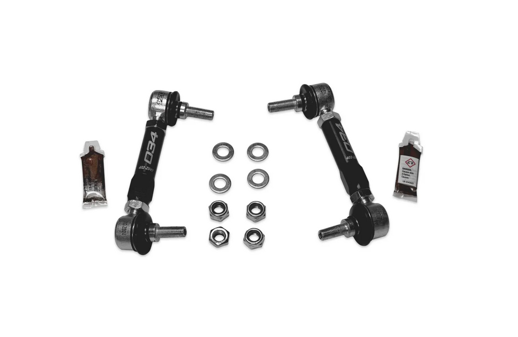 By utilizing our 034Motorsport adjustable end links, the lengths of each end link can be adjusted so that the end link can be easily installed at ride height without needing to twist the bar to get it to fit. Zero preload provides symmetrical handling in right and left turns.