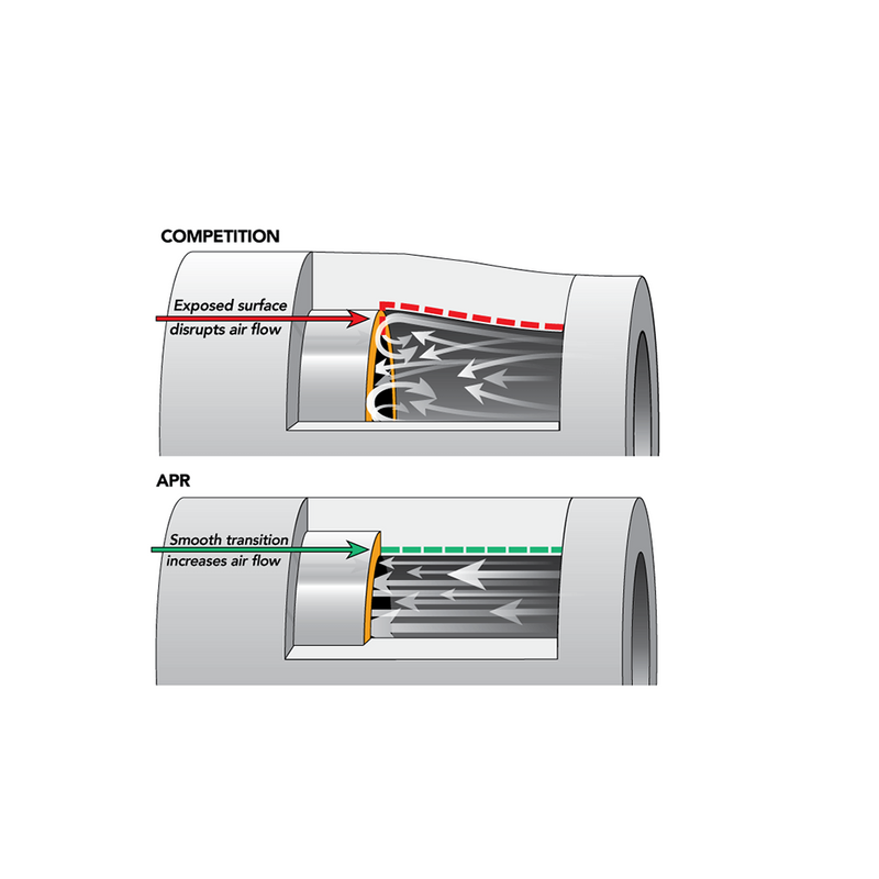 The included stainless-steel Clampco T-bolt clamps prevent the hoses from coming lose under heavy pressure and under high temperatures, silicone adheres to its mating surface, further minimizing leaks and hose slippage. APRs EZ-Flow stepped design creates a smooth airflow path, reducing turbulence over non-stepped designs.