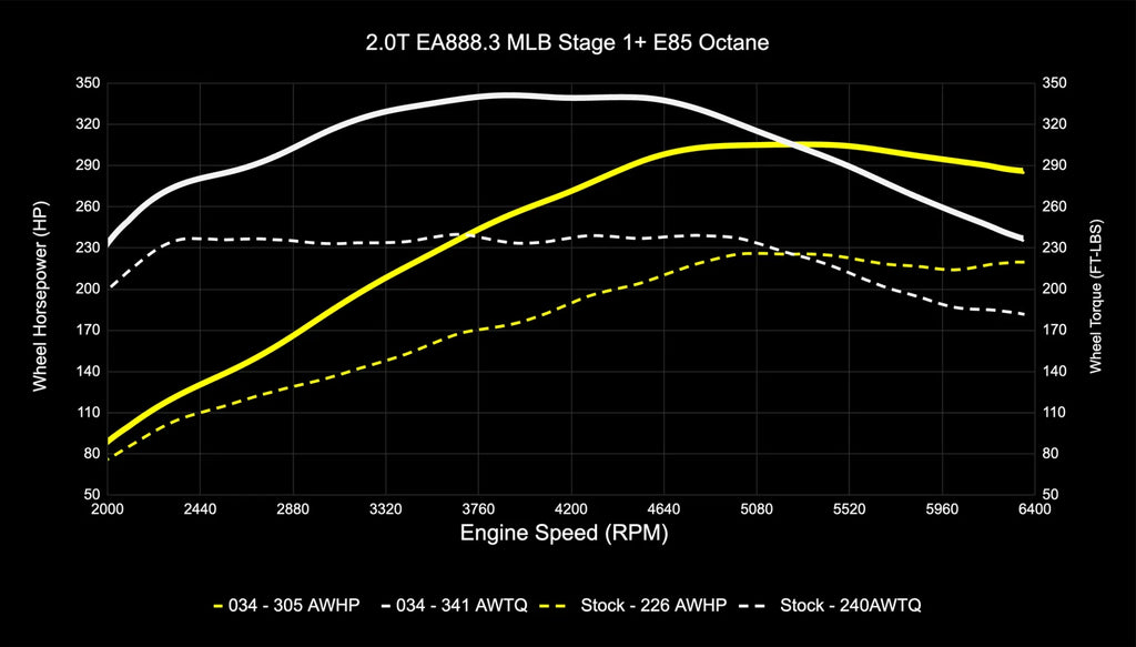 034Motorsport Stage 2+ Performance Software for the EA888 Gen 3 2.0T running pump gas or ethanol is engineered to safely increase the horsepower and torque with an upgraded high pressure fuel pump and the addition of an upgraded Intake System, 034Motorsport’s Cast Stainless Steel Racing Catalyst, and upgraded intercooler. The Upgraded Catalyst allows for increased exhaust flow with the factory turbocharger, while 034Motorsport’s proprietary calibrations safely yield additional power from the EA888.3 2.0T engine.