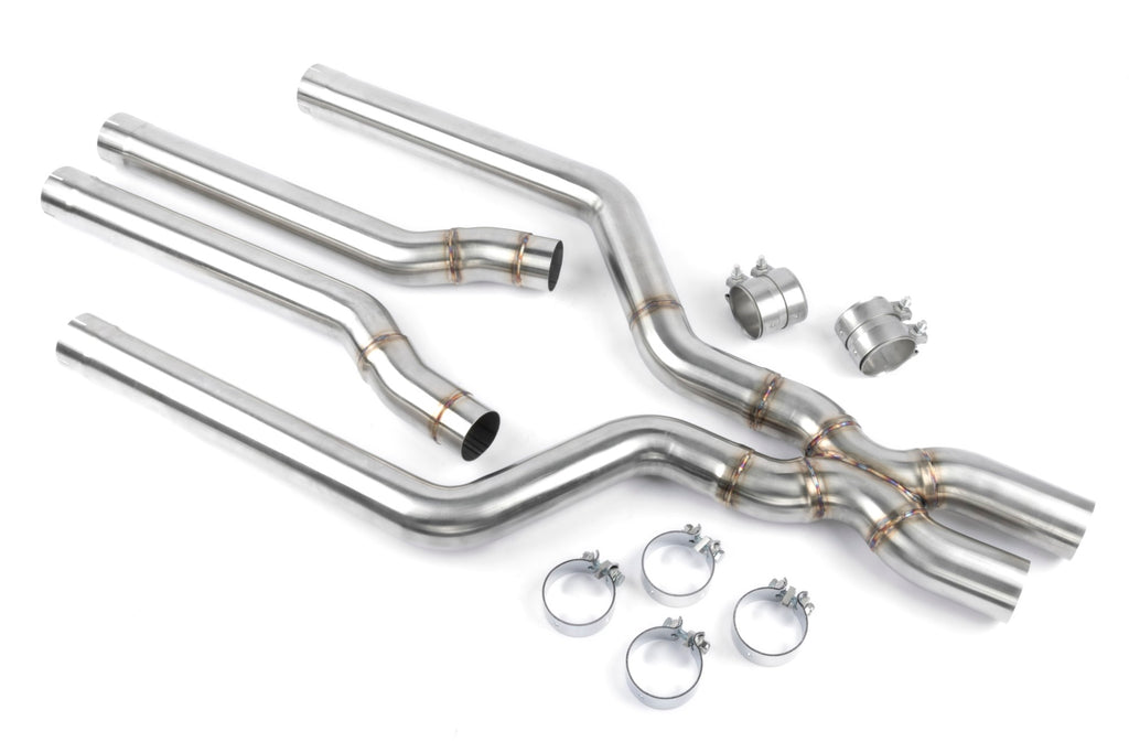 This full mid-section kit removes the hydro-formed factory center section, including the resonator, and replaces it with larger 3.25" T304 stainless steel tubing for freer flowing capabilities. In place of the factory resonator, Dinan incorporates a beautifully crafted X-pipe made from mandrel-bent tubing for minimum restriction, unlike stamped X-pipes which are commonplace in the market. This hand-made 'X' is not only the focal point of the system in terms of aesthetics but also the star when it comes to the effects on the sound. Promoting even flow to both banks of tips, the 'X' removes unwanted nuances in sound caused by uneven exhaust flow that is found in stock systems. Along with the inherent benefit of increased volume by removal of the resonator, the Dinan X-Pipe for the F9x X5M/X6M produces a louder, smoother and fuller exhaust note.