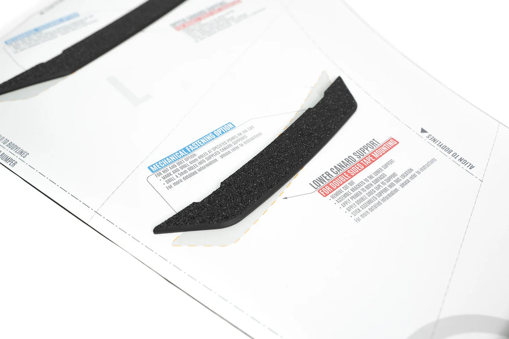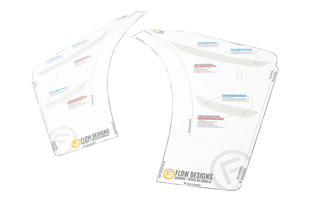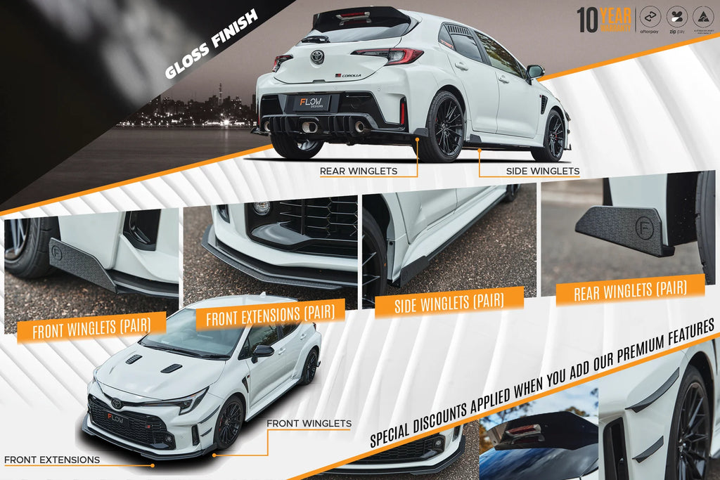 The new Flow Designs splitter set for the Corolla GR offers a gloss or textured finish and includes front/side splitters & rear spats/Flow-Lock rear diffuser. Pre-pressed in threaded brass inserts accept all our add-on accessories for the GR such as winglets and front splitter extensions.