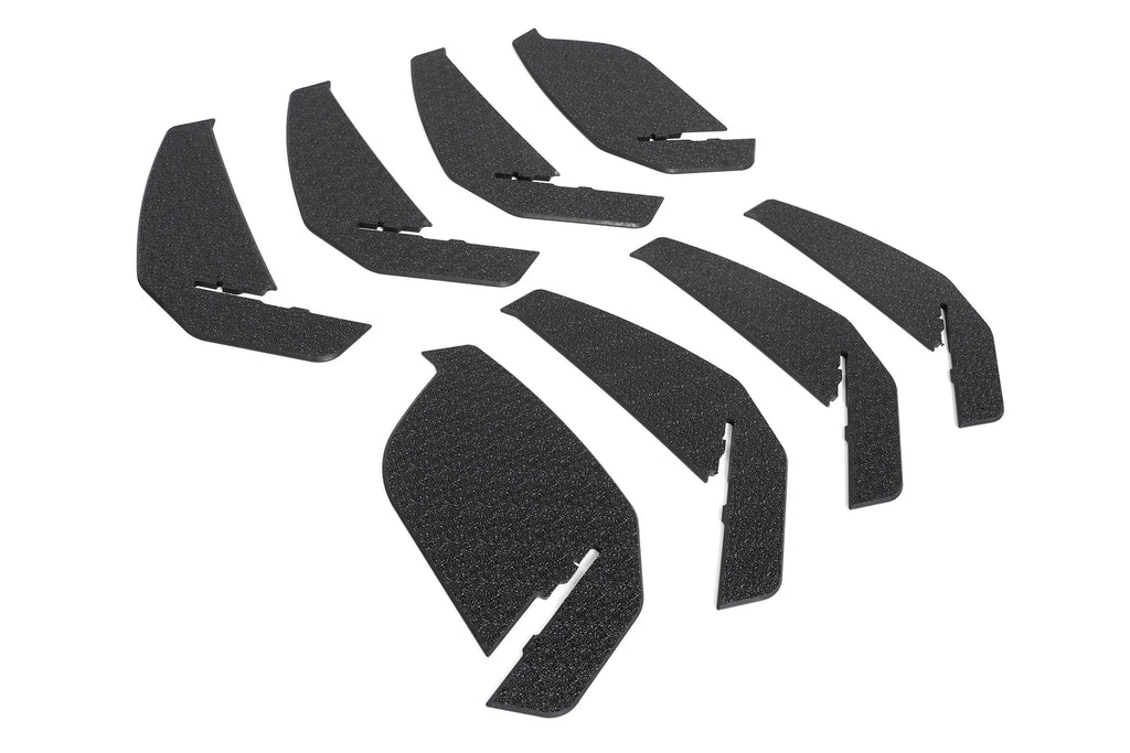 - Front lip splitter, side skirt splitters, valance, rear pods/spats: