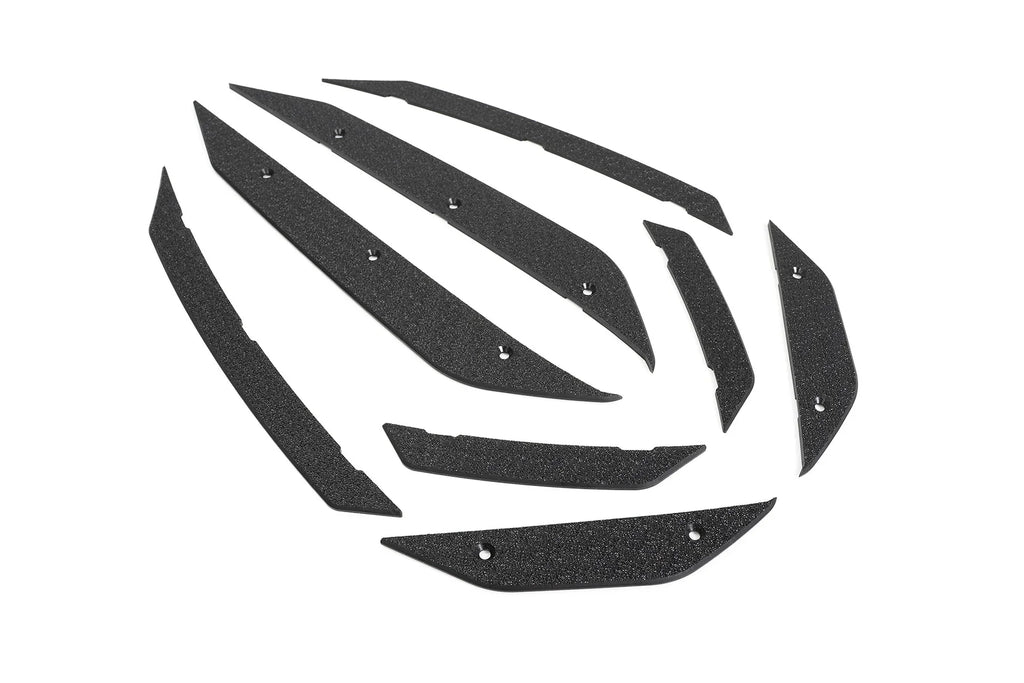 - Front lip splitter, side skirt splitters, valance, rear pods/spats: