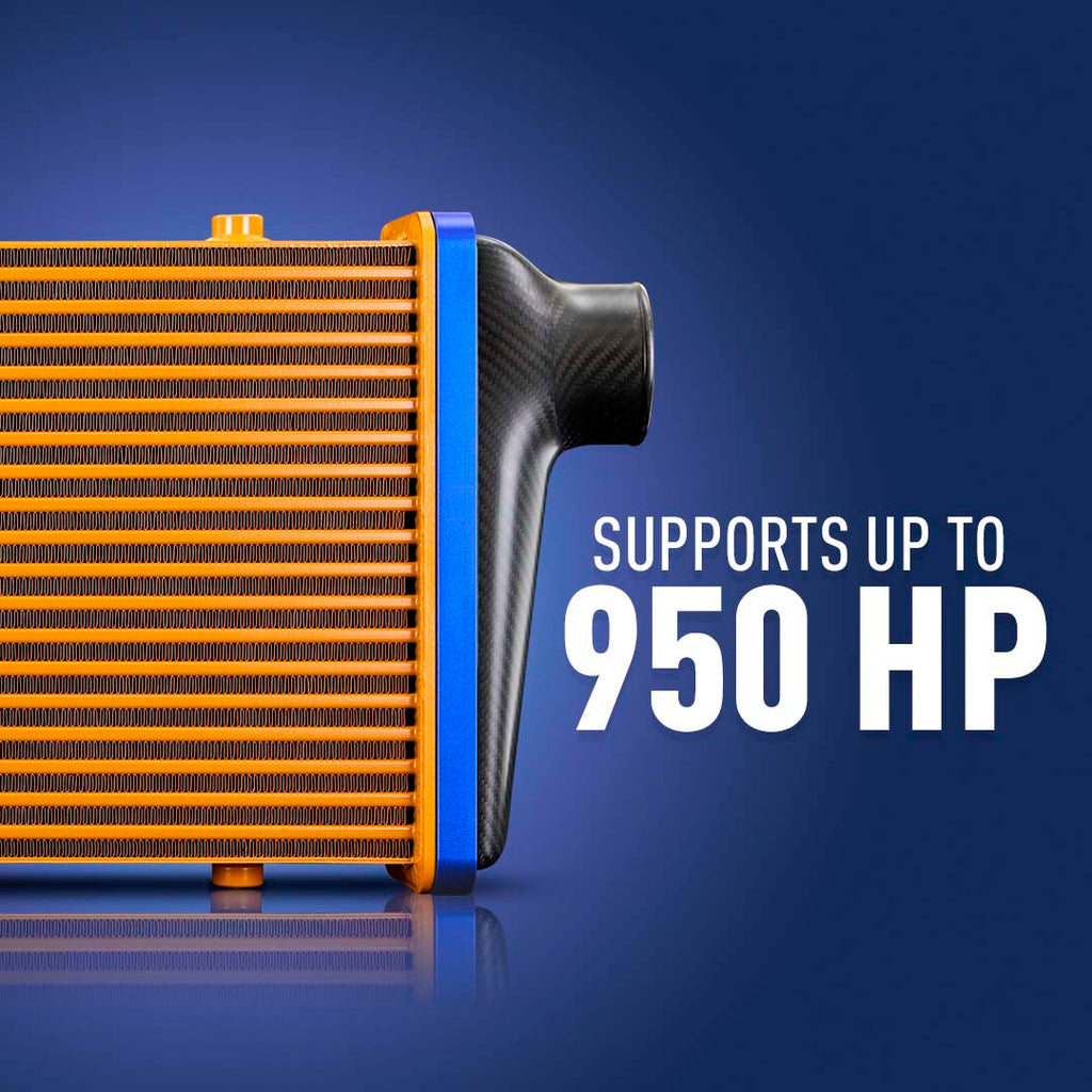 The end tanks are formed from solid 3K twill-woven carbon fiber. Carbon fiber gives our end tanks more strength than aluminum with 70% less weight. Three sizes of custom-engineered cores between the carbon fiber end tanks, combined with 3-inch inlets optimized for flow, ensure our intercooler is up to the task for builds producing up to 950 horsepower and 32 PSI of boost. The one-of-a-kind V-band core clamps hold the end tanks tight to the core under boost without the use of adhesives that can fail after repeated heat cycles. To ensure the end tanks can hold up to the rigors of road or track, they've been independently laboratory tested to SAE J400 standards for gravel impacts. With the Mishimoto carbon fiber intercooler, you don't have to sacrifice performance or strength for lightness.