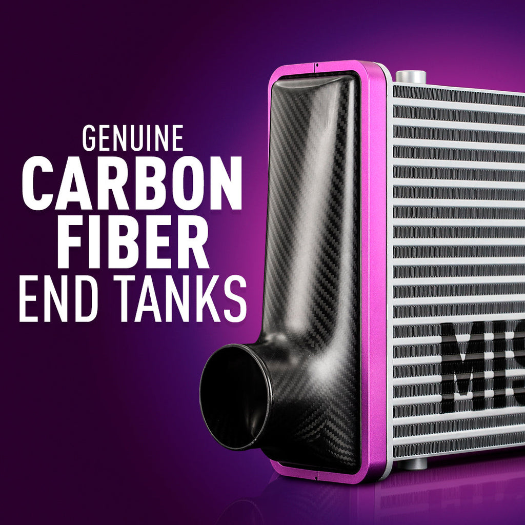 The end tanks are formed from solid 3K twill-woven carbon fiber. Carbon fiber gives our end tanks more strength than aluminum with 70% less weight. Three sizes of custom-engineered cores between the carbon fiber end tanks, combined with 3-inch inlets optimized for flow, ensure our intercooler is up to the task for builds producing up to 950 horsepower and 32 PSI of boost. The one-of-a-kind V-band core clamps hold the end tanks tight to the core under boost without the use of adhesives that can fail after repeated heat cycles. To ensure the end tanks can hold up to the rigors of road or track, they've been independently laboratory tested to SAE J400 standards for gravel impacts. With the Mishimoto carbon fiber intercooler, you don't have to sacrifice performance or strength for lightness.