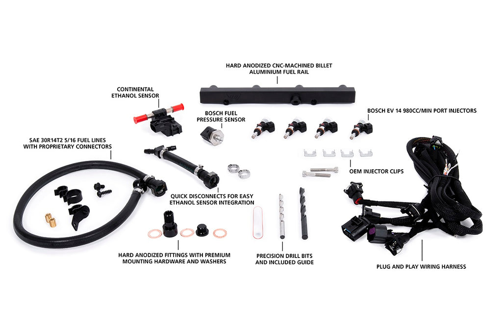 - Genuine Bosch Motorsport 980CC Fuel Injectors - Bosch Motorsport EV 14 980cc Fuel Injectors are utilized along with a genuine Bosch Fuel Pressure Sensor for increased flow and power.
