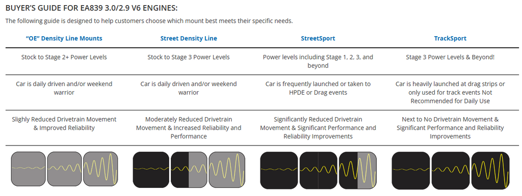 The 034Motorsport Street Density Motor Mounts are designed to be an OEM+ replacement for B9/B9.5 Audi S4/S5/SQ5 3.0 TFSI, RS4/RS5 2.9 TFSI, & 4M/4M.5 Q7 3.0 TFSI. These mounts offer improved performance and decreased deflection over the stock S/RS Audi motor mounts, without the failure-prone liquid-filled design.