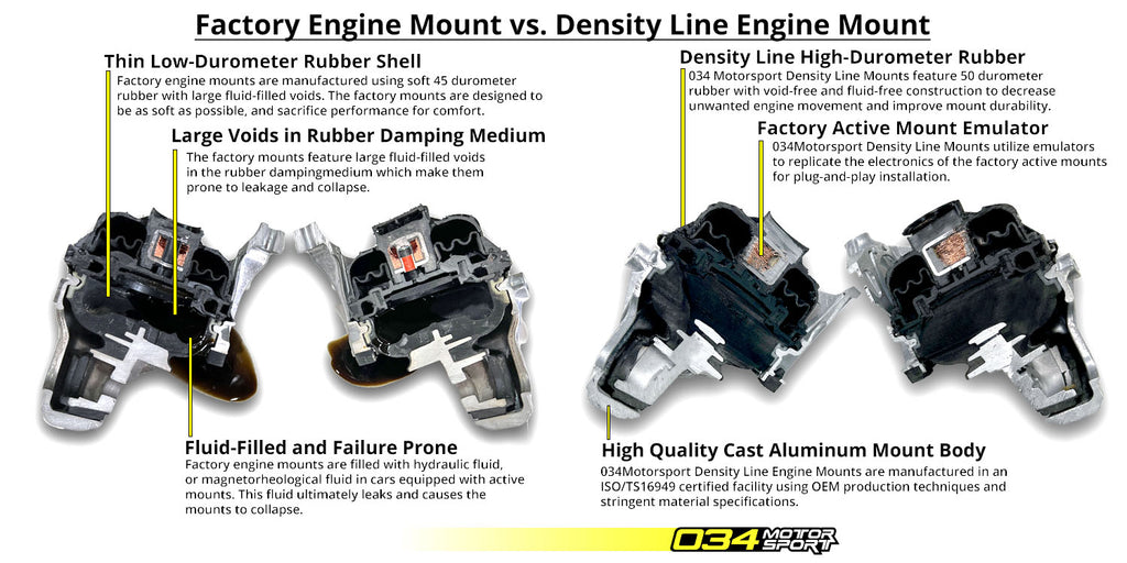 034Motorsport Street Density Motor Mounts are the new standard in comfort and performance. These mounts are redesigned with performance in mind, and manufactured from high-durometer rubber for increased performance and durability, without sacrificing comfort. Street Density Motor Mounts are optimized void-free and fluid-free, eliminating the slop and the possibility of leakage and collapse associated with the factory mounts. The mount bodies are made from high-quality cast aluminum using OEM production techniques and employ emulators to replicate the electronics of the factory motor mounts for plug-and-play installation. This ensures MIL-free operation for cars equipped with active motor mounts.