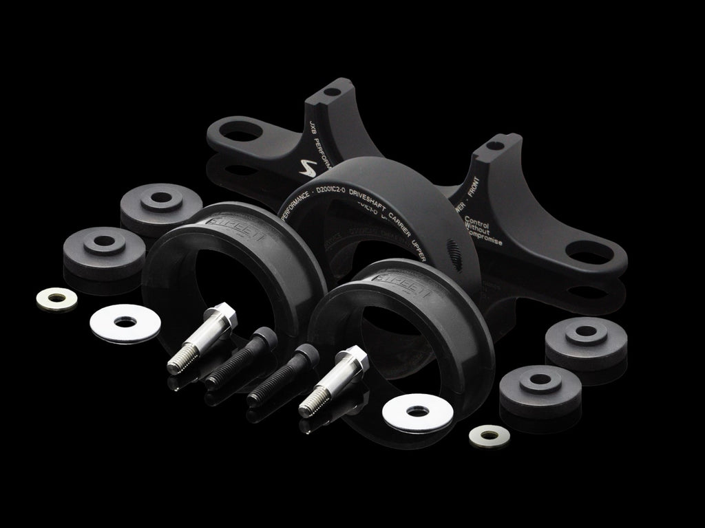 The stock center support bearing carrier is designed to reduce NVH to the cabin by loosely holding the center bearing with flimsy rubber spokes. During launches and shifts, the driveshaft is allowed to travel off-center, decreasing throttle response and causing oscillations through the drivetrain. As they age, the carrier rubber sags and dry rots, ruining the driveshaft alignment.