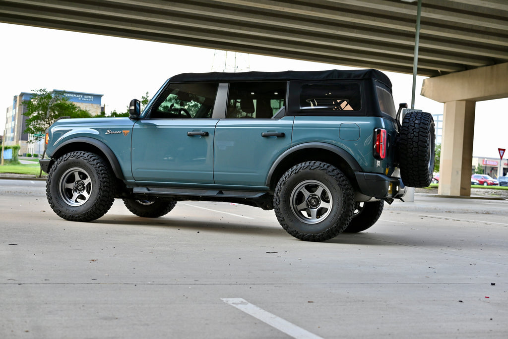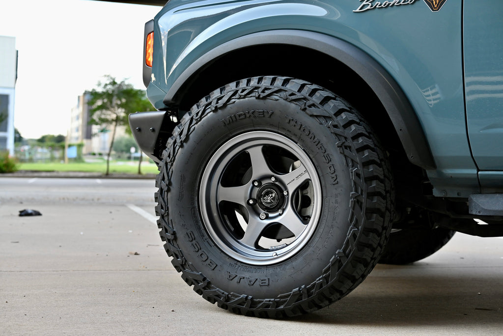 - Bronco shown in photos with Light Gun Metallic finish with Low Profile Black Center Caps. Tires are 35x12.50.
