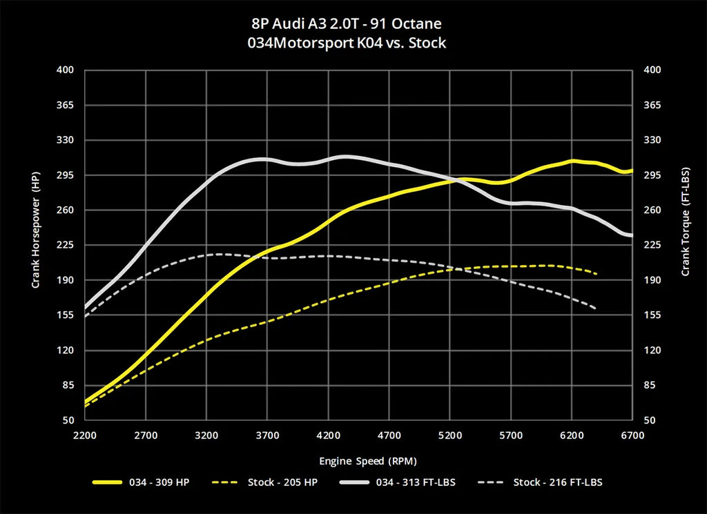 034Motorsport K04 Performance Software for the EA113 2.0T FSI engine is engineered to further increase horsepower and torque with the addition of an 8P Audi S3 2.0T FSI K04 turbocharger, 8P Audi S3 2.0T FSI fuel injectors, high-pressure fuel pump (HPFP) upgrade, 3-bar Map Sensor, high-flow downpipe upgrade, and performance air intake. 034Motorsport's calibrations optimize the factory ECU for these hardware modifications in order to extract additional power from the 2.0T FSI engine.