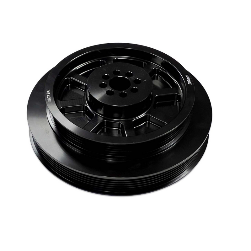 The 034Motorsport 3.0 TFSI Supercharger 207mm Crank Pulley Upgrade is machined from a single piece of 6061-T6 billet aluminum, and anodized black for an attractive finish resistant to corrosion. This design is 60% lighter than the OE pulley, significantly reducing rotational weight and parasitic loss. This is a single-piece inner and outer pulley, not a pulley "overlay", which adds rotational weight.