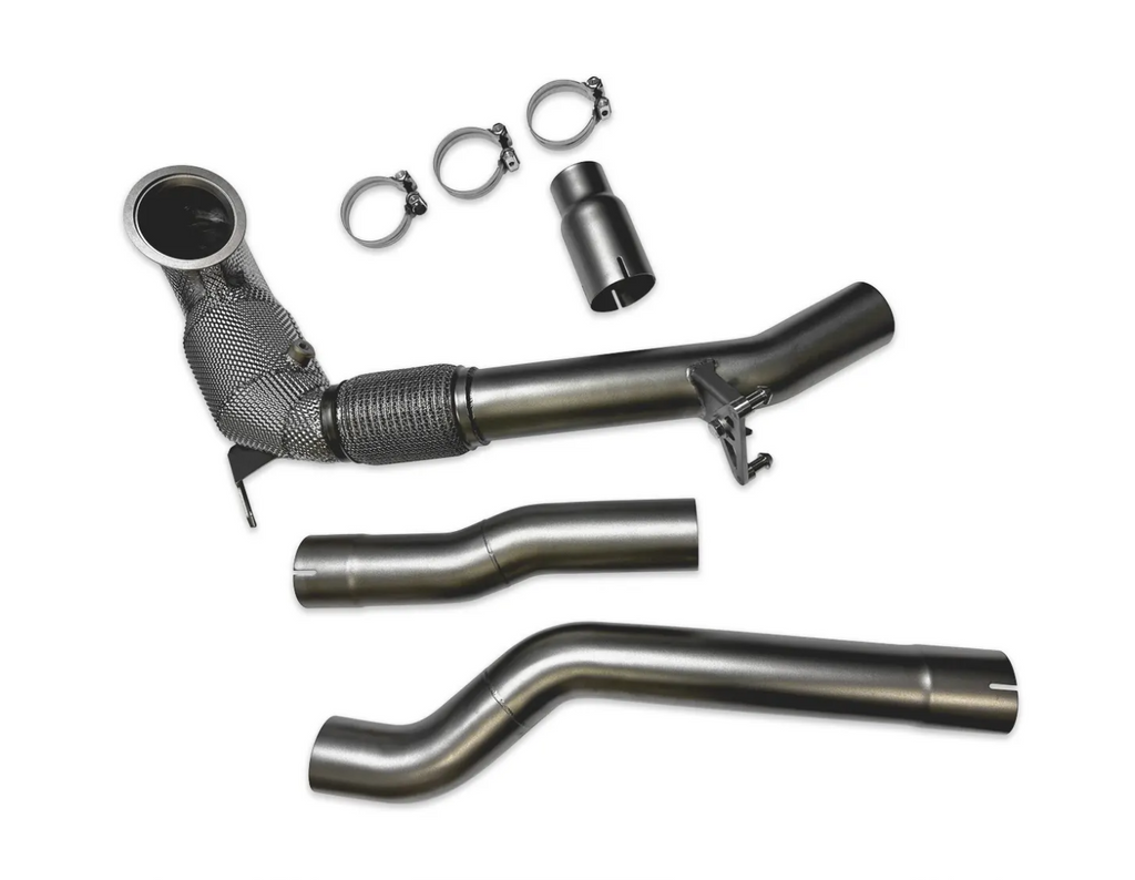 The 034Motorsport Stainless Steel Racing Downpipe for Mk8 Golf R & Audi 8Y S3 models equipped with EA888 Gen 4 2.0T engines is the ultimate upgrade over the factory downpipe. Offering increased horsepower and torque throughout the powerband, reduced turbocharger lag, and an enhanced exhaust note, this is the ultimate downpipe solution for the discerning Audi/Volkswagen enthusiast. Optimized for increased flow and maximum performance, the MQB-Evo 2.0T Cast Stainless Steel Racing Downpipe features organic geometry and a Euro 4 300-Cell racing catalytic converter in the factory location. This complete downpipe solution includes an integrated v-band flange at the turbine outlet, integrated oxygen sensor bung after the catalyst, OEM-style corrugated flex bellow, and factory-location exhaust hanger. The MQB-Evo 2.0T Stainless Steel Racing Downpipe is constructed from 304 stainless steel and TIG-welded & backpurged for maximum durability and titanium look finish for maximum corrosion resistance, and includes an integrated OE style heat isolation barrier to minimize exhaust heat transferred into the engine bay.