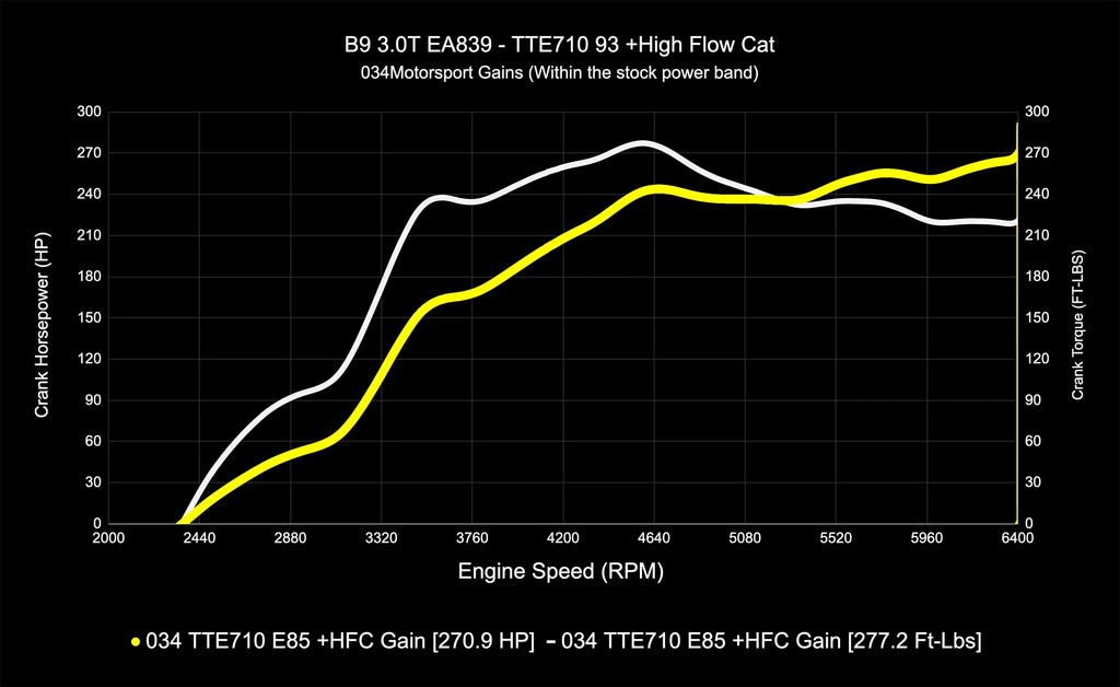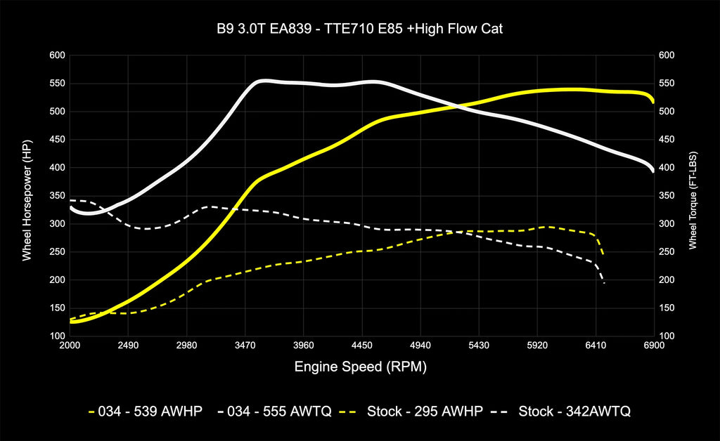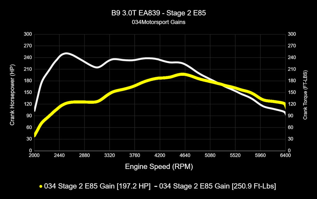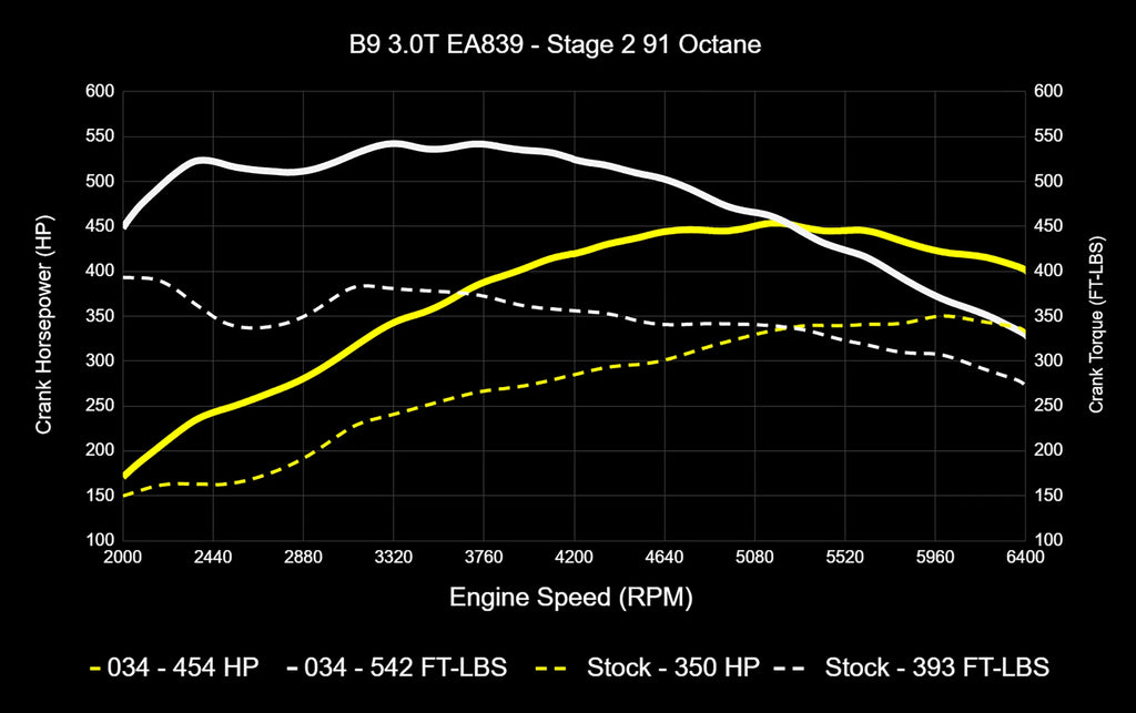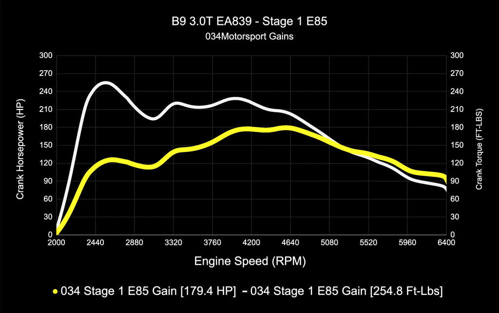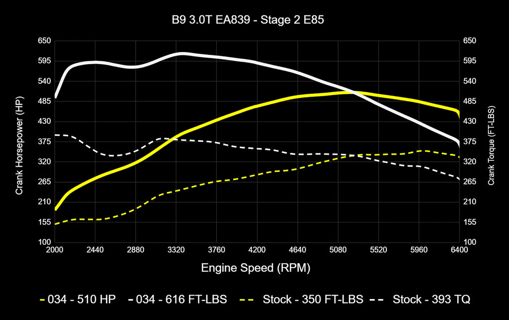 034Motorsport Stage 2 Performance Software for the EA839 3.0T engine running pump gas or ethanol is engineered to safely increase the horsepower and torque with the addition of 034Motorsport’s Stainless Steel Racing Catalyst and upgraded intercooler. The Upgraded Catalyst allows for increased exhaust flow with the factory turbocharger, while 034Motorsport’s proprietary calibrations safely yield additional power from the EA839 3.0T engine.