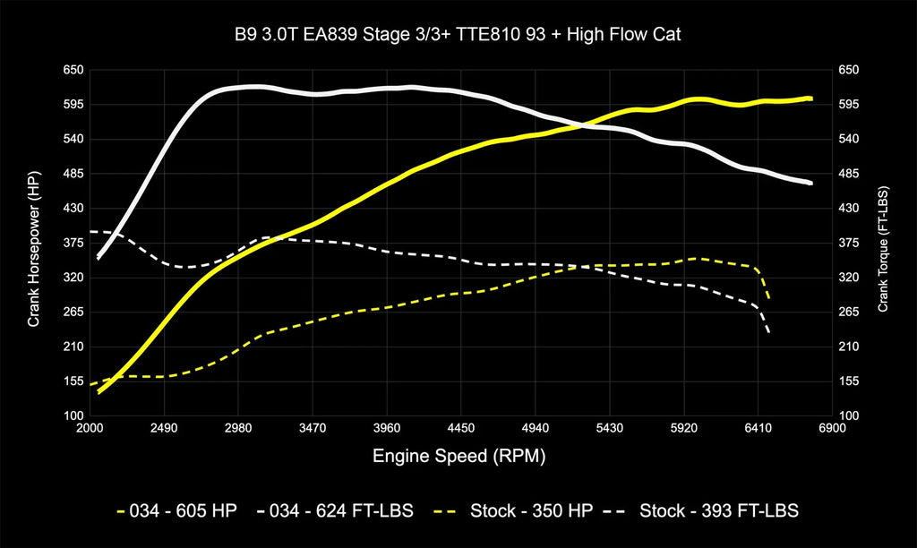 034Motorsport Stage 3/3+ Performance Software for the EA839 3.0T equipped with TTE710, Pure750, or TTE810 Hybrid Turbocharger (running pump gas or ethanol) is engineered to safely increase the horsepower and torque beyond the stock turbocharger. Significant time was spent refining and safely optimizing the TTE710, Pure750 and TTE810 Turbocharger calibrations to ensure unrivaled drivability and uncompromised reliability. While many tuners can achieve great power figures that look impressive on a dyno sheet or a webpage, the key to a truly substantive and transformative software upgrade lies in the strategies employed to make power efficiently and safely.