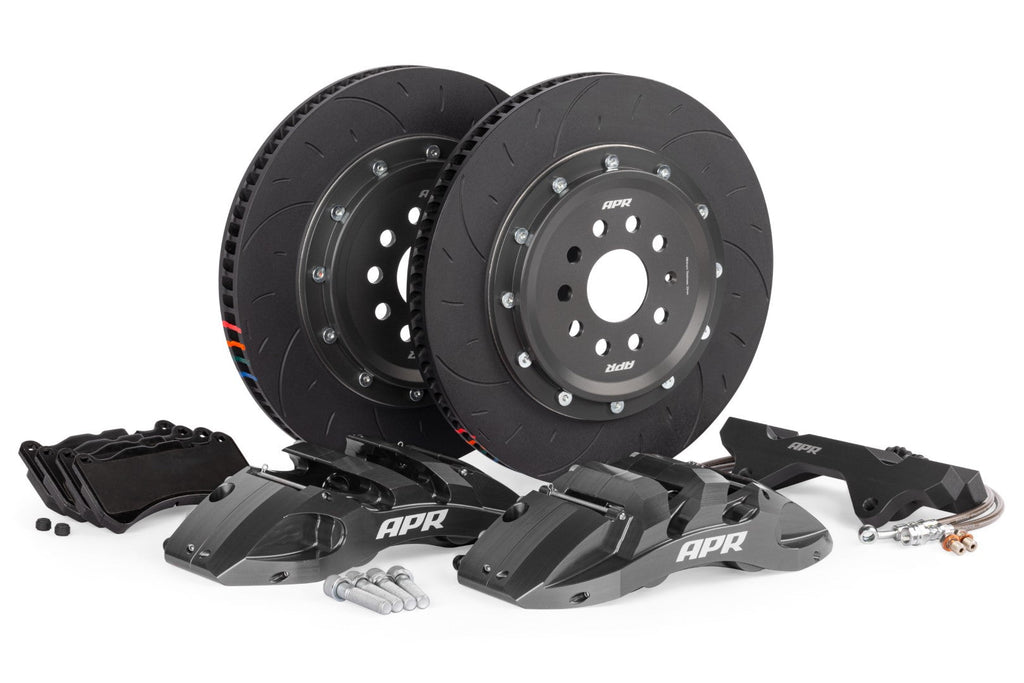 APR's 370x34mm 2-piece 6-piston Big Brake Kit (BBK) is an ultra-high-end solution for maximum stopping power. Each feature-packed solution is specifically tailored to your vehicle and provides exceptional stopping-power in a wide operating range from daily driving to professional racing. Because of this, the system provides the correct brake bias and integrate perfectly with the ABS and stability systems which is critical under emergency braking situations. This upgrade handily out-brake, out-last, and out-perform massive non-vehicle application specific OEM swap kits, and rivals much more expensive top-tier systems. Whereas most systems on the market either make heavy sacrifices to either look fancy, cut weight, or cut costs, the APR system is designed to simply brake better, last longer, and stand the test of time!