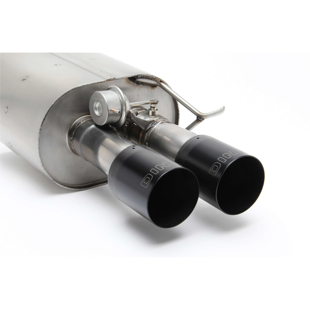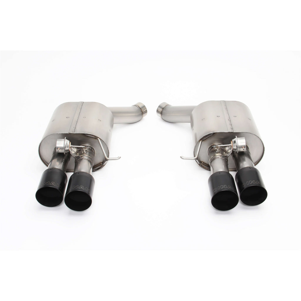 Dinan's Free Flow Axle-Back exhaust system features 100% stainless steel construction measured to exact specifications to ensure proper fit via factory hangers and mounting points. Dyno tuned for maximum exhaust flow with minimum backpressure, this system is designed to provide a more aggressive sound under acceleration while reducing drone inside the vehicle, thanks to Dinan's exclusive Helmholtz Chamber and Butterfly Valve technologies. The exhaust gasses exit through larger laser engraved ultra durable polished, or ceramic black, quad tips.