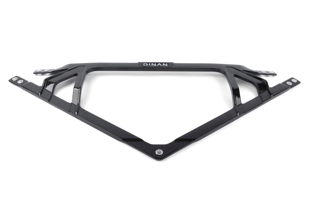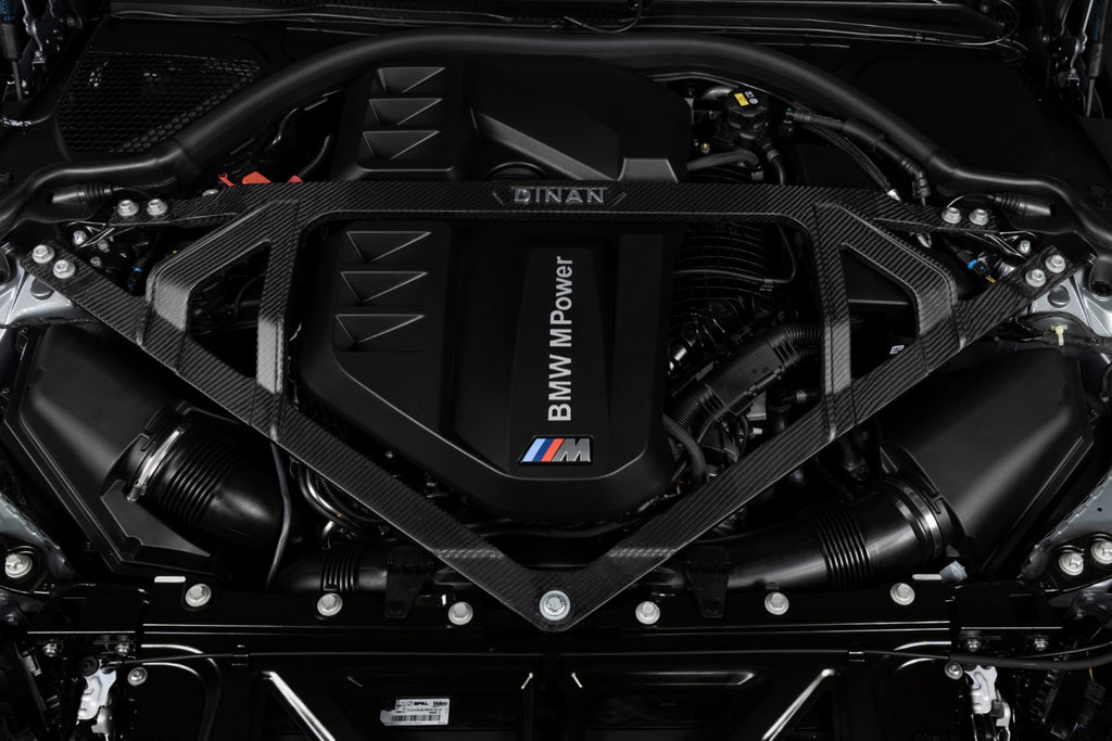 The imposing carbon fiber brace can be installed in a matter of minutes and used in conjunction with either the stock or Dinan intake systems. While the brace was designed to specifically tie into the latter for a harmoniously balanced and unified appearance the brace can also stand on its own and elicit nearly as equally an impressive visual.
