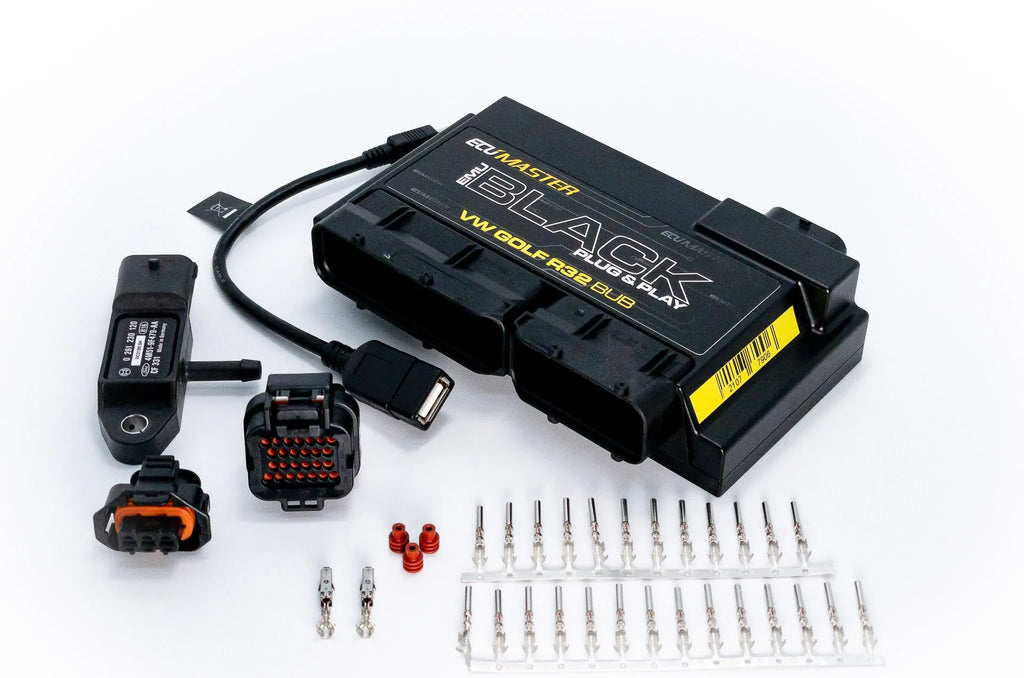 ECUMASTER Black Plug-in ECU for the Volkswagen Golf R32 MK5 VR6, Audi A3, Audi TT with BUB engine code allows for plug and play installation.