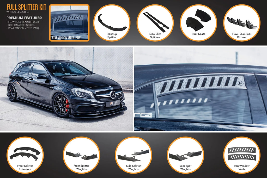 The Mercedes-Benz A45 AMG Pre-Facelift (W176) body kit splitter set includes front lip splitter, side skirt splitters, Flow-Lock rear diffuser, rear pods/spats and our full accessories range of extensions and winglets all round. Easy installation instructions are included and certain parts in the A-Class A45 AMG range does not require bumper removal. We guarantee our A-Class A45 AMG body kit splitter set is the most durable on the market and will complete your exterior aesthetic by giving it a more aggressive look.
