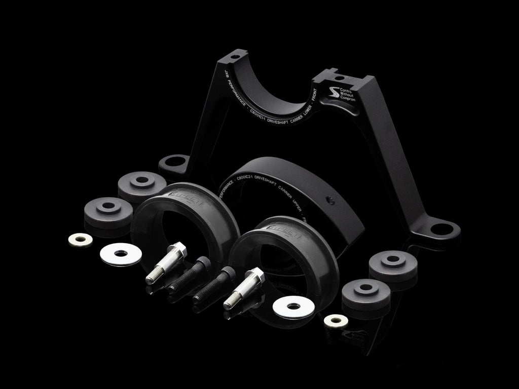 The stock center support bearing carrier is designed to reduce NVH to the cabin by loosely holding the center bearing with flimsy rubber spokes. During launches and shifts, the driveshaft is allowed to travel off-center, decreasing throttle response and causing oscillations through the drivetrain. As they age, the carrier rubber sags and dry rots, ruining the driveshaft alignment.