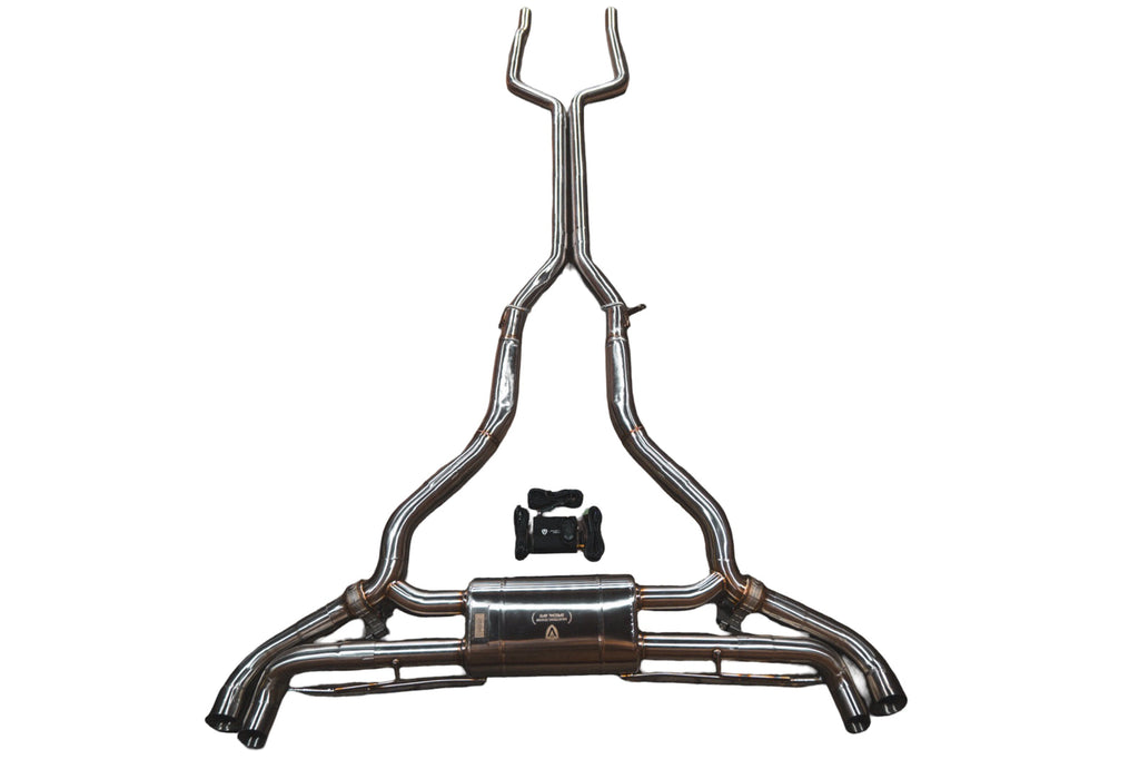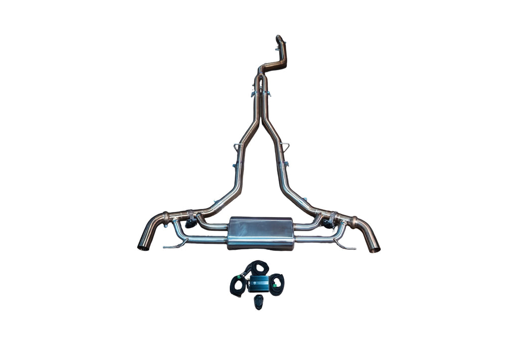 Welcome to the full exhaust suite for the BMW X7 M60i + Alpina XB7 platform. Connecting to stock or aftermarket free flow downpipes, the valved exhaust measures 2.75 inches from inlet to outlet. This system runs unrestricted all the way back to the tips. In our testing and development of this platform, we found that running the setup unresonated provided a more raw sound experience and insane snaps when you change gears. This system comes with a separate electronic valve controller to allow the driver to operate the exhaust system at all RPMs, and to the fullest extent to maximize enjoyment. Inside the car the experience remains refined and enjoyable at all speeds. There is no drone in the cabin with the valves closed, and when you're enjoying the vehicle with the valves open, the pops and cracks are more pronounced than stock and the vehicle has a much more motorsport sound to it The M50i powertrain sounds decent from the factory but at Valvetronic Designs, decent doesn't cut it.
