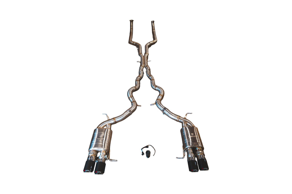 Connecting to OEM or aftermarket free-flow downpipes, this system runs 3.0 inches from inlet to outlet and features a large X-pipe crossover for superior scavenging and response. Exhaust flow then passes through our valved mufflers, exiting via your choice of premium tips. A vacuum-actuated valve system with included controller ties into the factory harness for full, on-demand sound control.